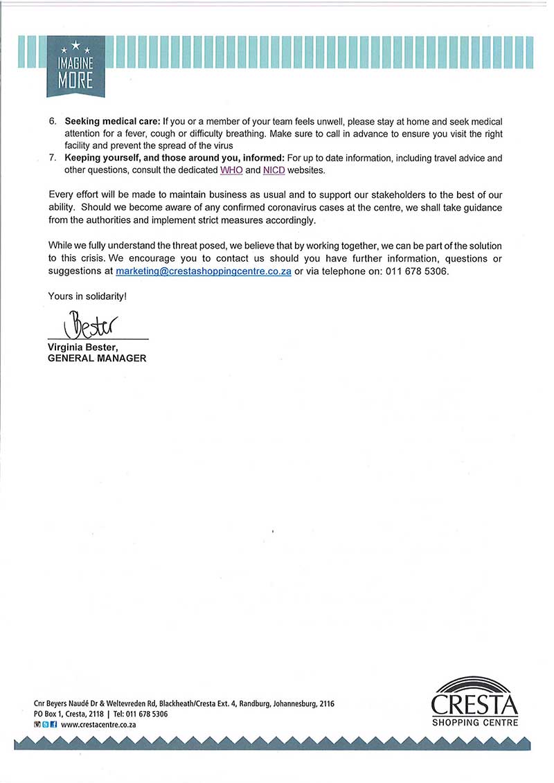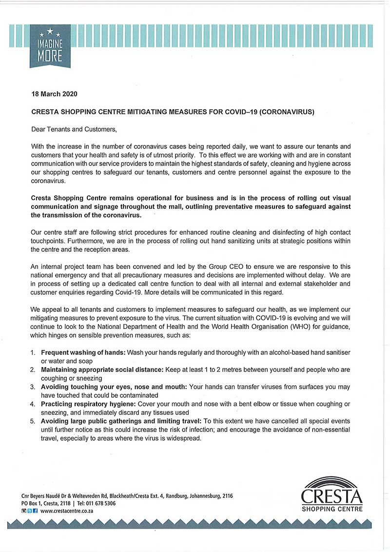 CRESTA SHOPPING CENTRE mitigating risks for Covid-19 (Coronavirus)